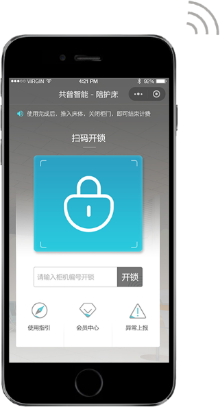 方案簡介: 針對住院陪護時陪護人員健康休息的老大難問題,共普智能研發的共享陪護床,通過手機小程序、公眾號、APP客戶端聯通共享陪護床設備,通過手機掃碼的方式,簡單便捷、自愿自管的方式,輕松解決陪護休息的大難題。